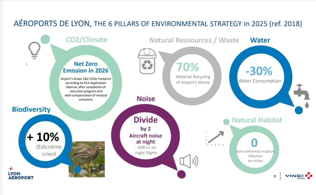 La empresa francesa ha tomado medidas importantes para la reducción de la huella de carbono, preocupándose a nivel de los edificios de la eficiencia energética tanto con estrategias pasivas y activas, la incorporación de biocombustibles en reemplazo de los combustibles tradicionales en la flota interior, incorporación de energías renovables fotovoltaicas y la disminución de emisiones por gestión de algunos procesos aéreos, como son las aproximaciones de los aviones antes del aterrizaje. “Las emisiones que no han podido ser reducidas son compensadas para llegar a cero, con un programa de trabajo con la región de Auvernia-Ródano que incluye reforestación con vegetación nativa”, concluye el profesional.